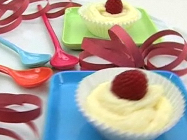 Рецепт десерта из белого шоколада.Состав:белый шоколад, сливки, малина, желатин, вода.